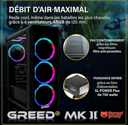 Comme la plupart des PC Gamers de haute performance, le Greed® MK2 peut générer un niveau sonore perceptible lors des sessions de jeu intenses ou des tâches gourmandes. Son système de refroidissement est efficace pour maintenir les températures, mais cela peut s’accompagner d’une augmentation de la vitesse des ventilateurs.